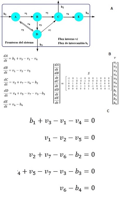 Entonces, de acuerdo con la idea básica de MFA, la distribución de fluxes es calculada mediante un balance de masa a todos los metabolitos internos de la red (Figura 1a y Figura 1b), el cual se representa matemáticamente a través de la Ec. 1: