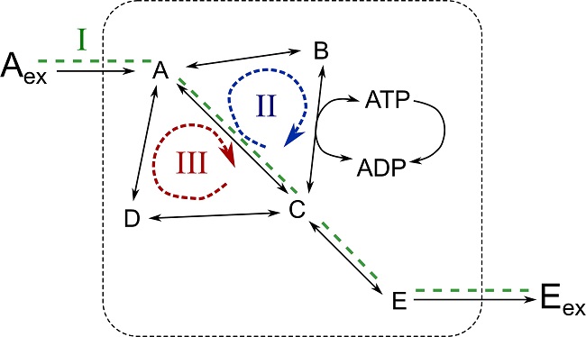 Tipo II: conocidas como ciclos fútiles (A→B→C→A, en azul). Las rutas extremas también tienen fluxes de intercambio que cruzan los límites del sistema, pero estos fluxes de intercambio solo corresponden a metabolitos como ATP, NADH, NADPH, H2O etc. Estas rutas deben ir en dirección favorable de energía libre, por ejemplo, involucrando el gasto de ATP, ATP→ADP + Pi.