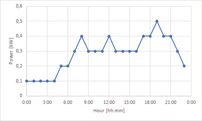 A study of the demand pattern has been carried out monitoring the electricity consumption of a typical family of three members on a routine day, getting as a result the daily power curve showed in Figure 1.