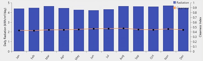 The solar resource data is presented in Figure 2, this energy is important because of the all-year permanent solar radiation the zone receives, and taking advantage of enough space to install solar photovoltaic panels 16.