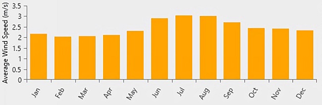 Another resource evaluated is wind 17, whose availability is shown in Figure 3. Making use of the databases available, it is evident that the wind resource is not what could be expected to take advantage of this type of energy, however this distributed resource has been taken into account for the optimization and for corresponding evaluation of possibilities 18.