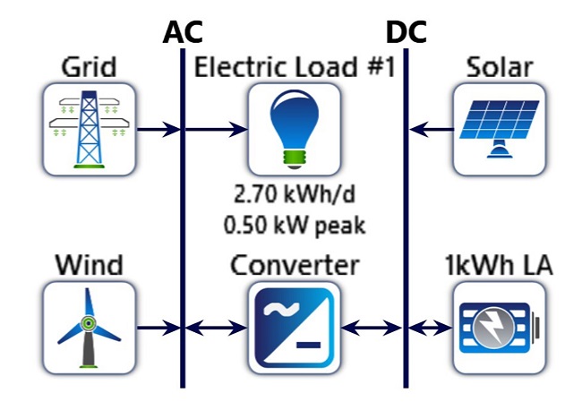 For the development of the Micro-Grid with penetration of renewable energy for the residential home proposed as the study case, it is used the software Homer Energy PRO 20. The Micro-architecture is presented in Figure 4, remarking that it is a connected microgrid to feed the load characterized on Figure 1 with photovoltaic panels and a wind turbine as renewable generation, a bank of batteries as energy storage and an inverter to change DC to AC current. The characteristics of the elements are presented on Table 1.