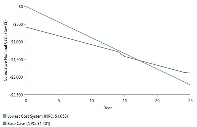 When the network operates with all its resources, we obtain the best percentage of renewable energy participation with an increase of the cost of energy and the whole capital needed. On the other hand, the network with the best LCOE only needs photovoltaic source without energy storage. Figure 5 and Figure 6 present the cash flow projection over 25 years, and as we can see the best opportunity to get a profit return is the case of solar generation without energy storage.