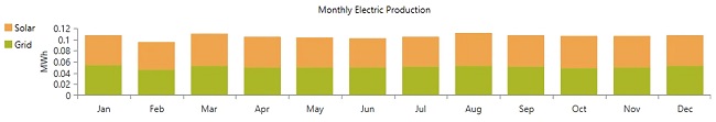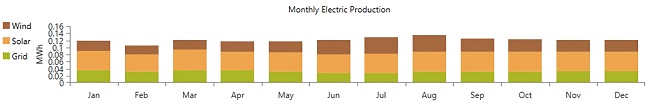 The amount of energy produced by the energy resources is presented in Figure 7 and Figure 8. Figure 7 shows that the grid electricity consumption is considerably reduced. Wind energy is quite variable with the best production registered in August. Solar energy represents the best resource. Figure 8 presents an increase of solar participation. However, without wind energy the rest of the energy is taken from the grid.