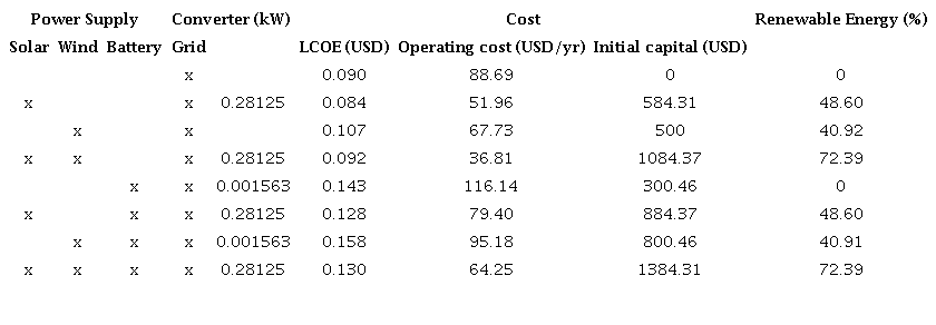 Homer Energy allows to analyze all possible networks derived from the architecture showed in Figure 4, the results of the optimization process are presented in Table 2. As we can see, photovoltaic resource is better than wind resource, due to the fact that the average wind speed is not good enough. Energy storage provides stability to the micro-grid specially in this case in which renewable resources are stochastic. However, the levelized cost of energy (LCOE) and the initial capital are raised.