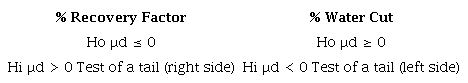 Together, we proceeded to deepen in detail the practices carried out at the national and international level, where the MEOR technique has been implemented, where the comparisons were established according to different parameters, pointed out in a kind of table-summary. For an effective MEOR process depends on the following parameters: temperature of the formation, viscosity of the crude oil, permeability, salinity, °API gravity of crude oil, pH, pressure, residual oil saturation, depth, porosity, bacterial content of the reservoirs 6. Especially the oil recovery factor (%) and water cut (%), once the technique was applied, for such comparisons, it became necessary to employ a statistical method known as Paired Sample Hypothesis Testing. This statistical method began by determining the differences between what the wells produced before treatment and their production after treatment through the simple equation that consists of subtracting the Pre-MEOR to the Post-MEOR. It is necessary to statistically demonstrate that the averages of these differences are greater than zero to verify that there was an improvement once the microbial treatment was applied, therefore, certain conditions are shows in Table 1.