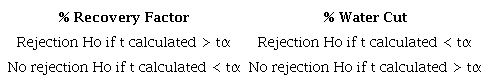 Where n is the number of observations (experiences that were considered for the study). Once the degrees of freedom were calculated, we proceeded to look for the statistical critical value (tα), intercepting this value with that of significance (tα). Since the sample has less than 30 elements (n<30), the population mean was estimated by the Student T Distribution (7) as shown in Figure 1. Once the test statistic (t calculated) is obtained, we proceed to comply with the decision rule as shown in Table 2 and thus make known the measures of the recovery factor and water cut.