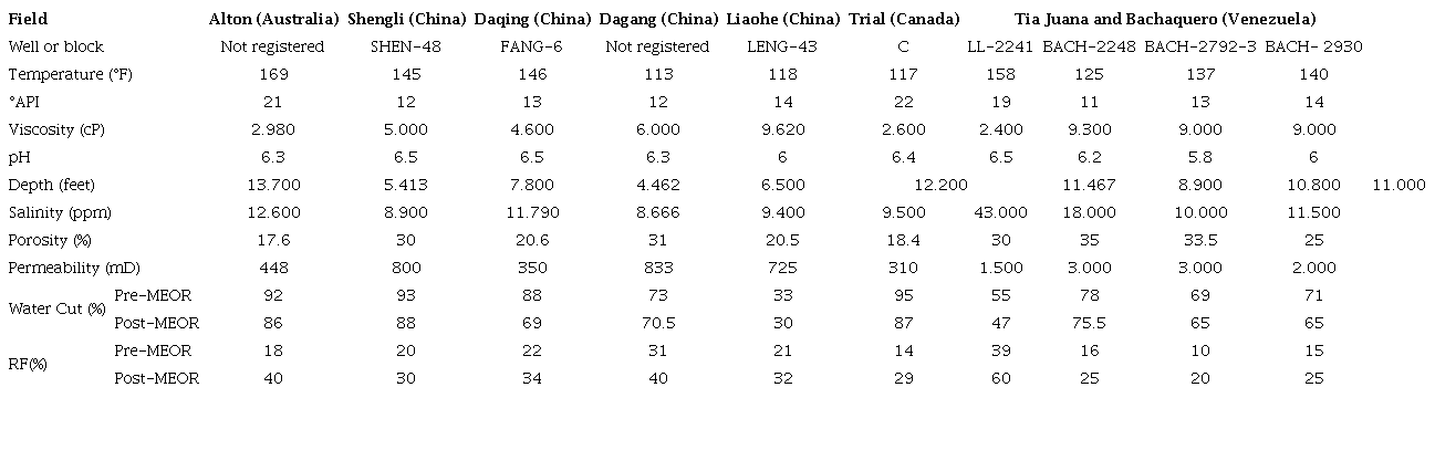 Table 4 shows the site conditions of each of the experiences in various countries where the MEOR process was implemented, which potentially influence microbial growth, survival and metabolic activities that generate them. Parameters such as temperature that in all cases exceed 100°F and are lower than 170°F establish a useful reference for subsequent practices, considering that all microorganisms have an optimal development temperature that characterizes them. In relation to the above mentioned, emphasis is made on the Alton (Australia) and Trial (Canada) fields that have the lowest porosities (17%-18%) within the disclosed practices, which maintain similarity as regards their API gravity, viscosity, depth and pH, generating good results in the increases of the recovery factor as well as decreases in the water cut.