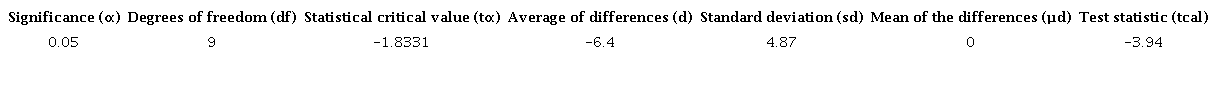 Being the mean of the differences, Sd the standard deviation of the differences (Eq. 3), µd the value to be tested assumed as zero, since it is desired to know whether it is greater or less than this to determine whether there was improvement in the process and the sample size.