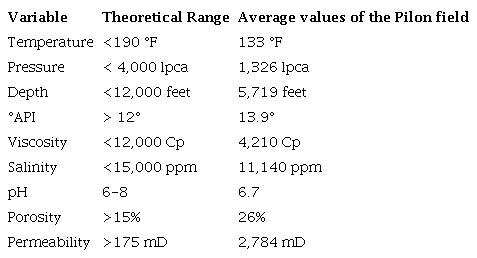 In Table 7 it is evident that the temperature of the wells in the Pilon field complies with one of the most relevant criteria in the MEOR microbial treatment. The fact that these wells comply with this requirement is satisfactory because the temperature can restrict the survival of microorganisms, growth and their metabolic products by exceeding the indicated limitations.