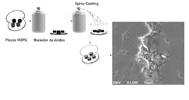 La funcionalización química sobre grafito pirolítica mediante el método de spray coating acido, originó adhesión de G y GO en la superficie de HOPG, estas características se analizaron mediante espectroscopia Raman donde evidenció la existencia de picos correspondientes al G y GO, además, se confirma la formulación con grupos carboxilo y grupos hidroxilos, se observa el patrón XRD del GO (10~ 26,6), microscopía electrónica SEM y análisis elemental EDS, se pudo observar la formación de porosidad en la superficie y un aumento de oxígeno en la composición elemental superficial.