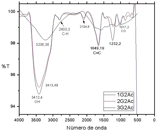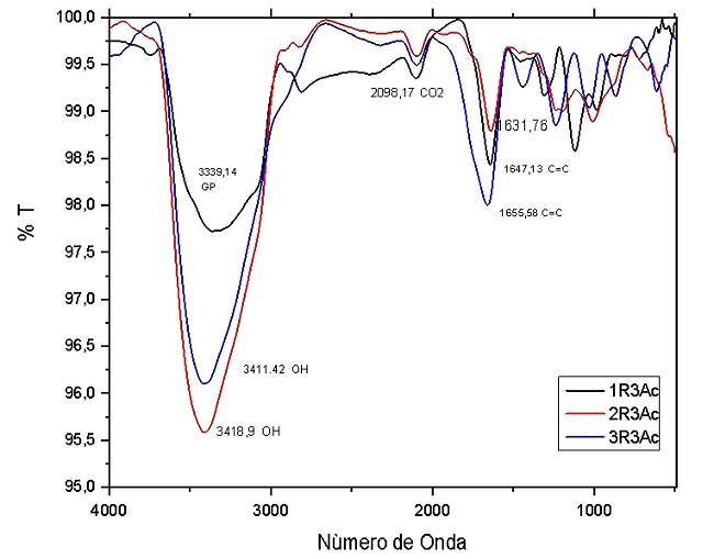 En la Figura 3 se realiza una comparación entre las placas HOPG funcionalizadas 3Ac, intervalos de tiempo de 2,4 y 6 horas, en las cavidades provocadas por la funcionalización. Se encontraron picos amplios en la banda de OH entre 3418 cm-1 correspondientes al en área de los óxidos grafeno de alta frecuencia junto con un pico agudo entre 1638.2 cm-1 - 1739.1 cm-1 el cual es atribuido a los enlaces C=C y C=O 28.