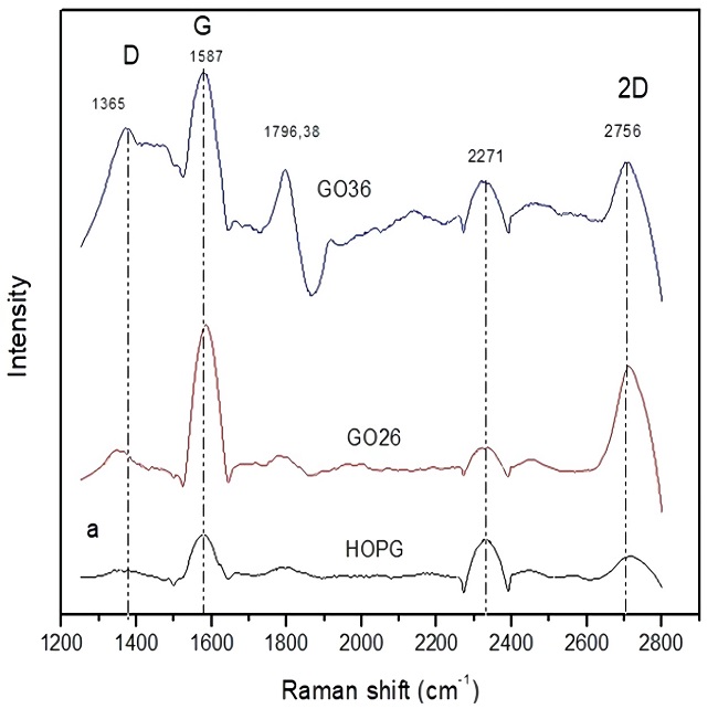 Con esto, en la superficie de las placas se obtienen grupos carboxílicos, grupos OH y grupos epoxi, logrando tener un procedimiento a bajo costo, no toxico, y sin tener fragmentación de la placa de grafito. El material resultante se caracterizó mediante microscopia electrónica de barrido (SEM), análisis (EDS), espectroscopia de transmisión de infrarrojo con transformada de Fourier (FTIR), y espectroscopia Raman. De esta manera, se obtuvo información los picos de G que son causados por las vibraciones en los átomos de carbono (1580 cm-1). Este pico refleja las cantidades de capas del grafeno. El pico D se considera como el pico de vibraciones desordenadas del grafeno. Este pico aparece entre 1270 - 1450 cm-1 y está relacionado con la longitud de onda de excitación que es causado por el movimiento reticular del centro de la zona de Brilloven. El pico 2D llamado pico de resonancia de 2 fotones aparece cerca de 2700 cm-1 (25.