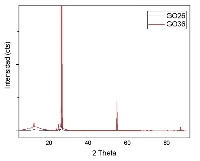 La técnica XRD se utilizó para medir el espacio promedio entre capas o filas de átomos. En la Figura 6 se muestran los espectros de la estructura cristalina para la identificación del GO por el método de spray coating con dos ácidos y tres ácidos, a medida que avanza la oxidación la intensidad de la línea de difracción (002) espacio 0.35nm en el grafito donde 2θ =26.5º, se va oxidando, apareciendo simultáneamente el GO exhibida en el pico de difracción de 2θ = 12. 6º con una distancia de 0.69 nm 4,30.