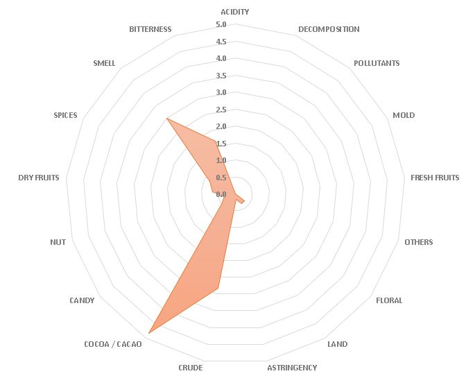 From natural fermentation # 2 (FN2); (Figure 5) on a scale of 0 to 10 that were present in the cocoa bean liquor; highlights its high cocoa flavor with a rating of 4.2; aroma of 3.8; bitterness of 3.0; astringency of 1.8; sweetness of 0. 8; acidity and nuttiness of 0.7; and finishing with nuts and spices of 0.3; as for defects, the raw descriptor was the most outstanding with a score of 2.2; and earth of 2.0; the other low intensity descriptors were not significant