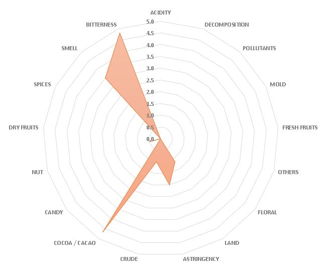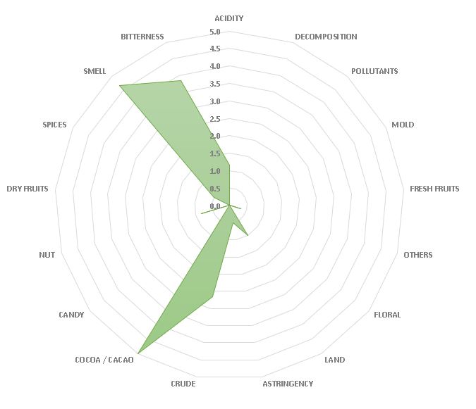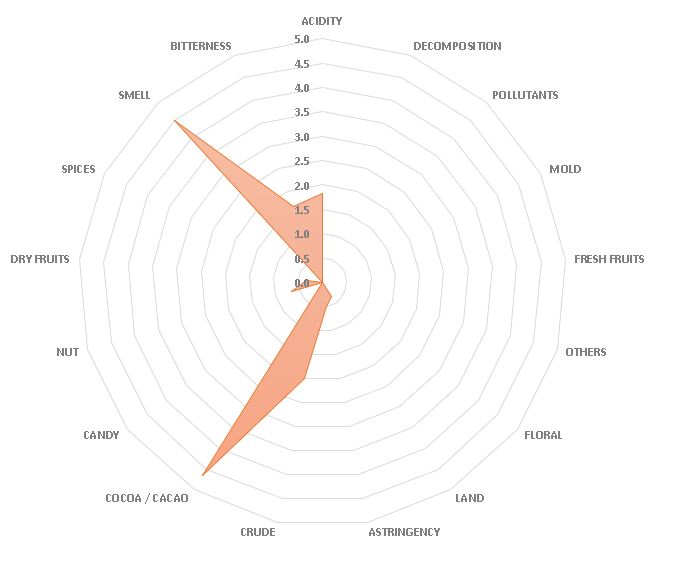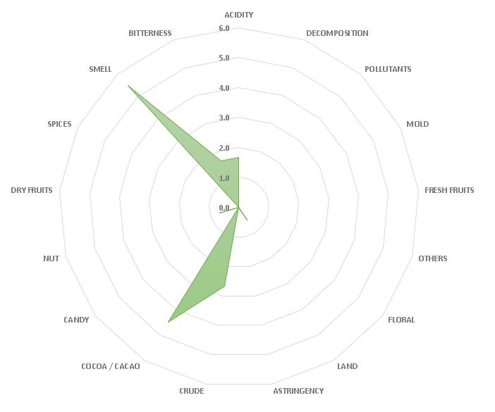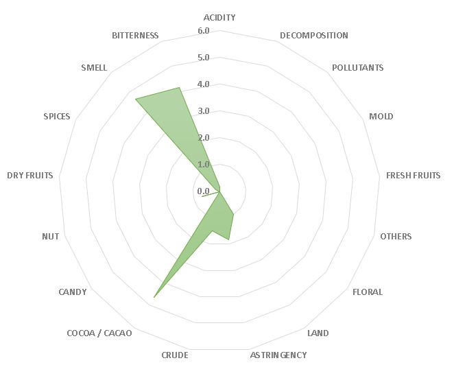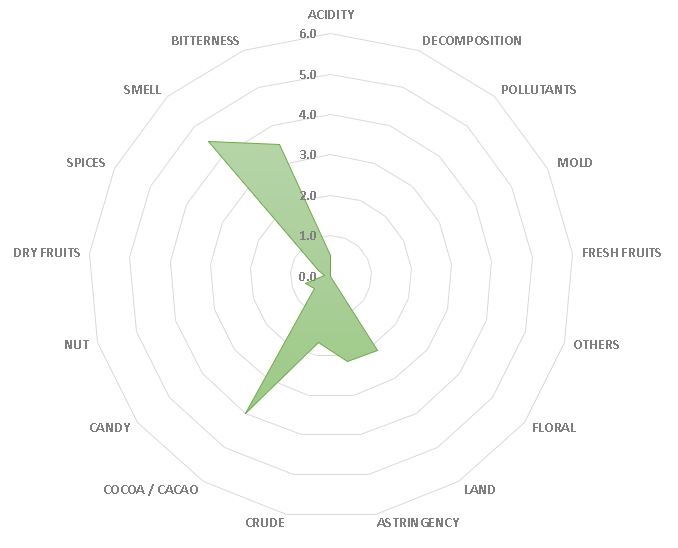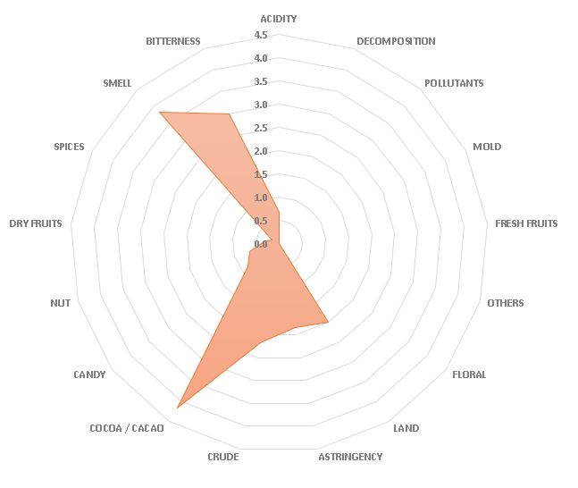 The fermentation with addition of inoculum #2 (FI2); (Figure 7), details the aroma characteristics with a score of 5.5, cocoa of 4.5; acidity and bitterness of 1.7; nutty of 0.7; the other quality descriptors were not significant. As for defects, crude was the most outstanding with a score of 2.7; and earth of 0.5; the other low-quality descriptors were not significant. For the fermentation with the addition of inoculum #3 (FI3) (Figure 8), the cocoa characteristics are detailed with a score of 5.0, aroma of 4.7, bitterness of 3.8, acidity of 1.2, leaving the other descriptors with non-significant values. As for defects, the crudeness of the sample was the most outstanding with a score of 2.7; soil of 1.0; the other low-quality descriptors were not significant.