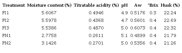 The moisture content of the grain (Table 3), according to the analysis, did not show a significant difference for the samples of fermentation with inoculum addition (FI1; FI2; & FI3), which ranged between 0.6226 and 0.6445 percent; but it did differ significantly from the samples of natural fermentation (FN1 & FN2), which ranged between 0.2596 and 0.2650 percent.