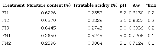 The fermentation treatments (Table 3), with inoculum (FI1; FI2; FI3) ranging from 0.6130 to 0.6939 and the natural fermentation treatments (FN1; FN2), ranging from 0.7124 to 0.7206, are in the records of no deterioration according to Buelvas G, 2016 23.