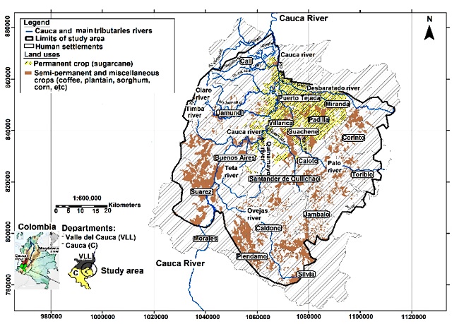 The Cauca River watershed was selected for its importance for the country, and due to is the supply source to 77% of the population of the Cali city (≈ 1900000 inhabitants), and it is highly impacted by agriculture 4. Considering the variability of chemical water composition of surface sources associated with land uses and agrochemicals in watershed areas 2,26,27, a map of study area was digitized in ARGGIS 9.3, locating the impacted areas by agricultural activities in the Cauca River watershed and identifying the predominant crops, according to Bueno et al. 1,28.