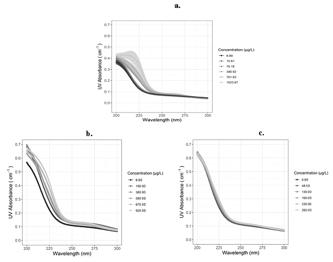 On the other hand, herbicides such as Diuron absorb UV light at 214 - 250 nm 25. Studies such as Bueno et al. 28 show the presence of compounds such as iron (1880 - 2110 mg/L), manganese (0.340 - 0.460 mg/L), nitrates (2100 - 4290 mg/L), nitrites (0.016 - 0.067 mg/L), and Atrazine (<0.001 - <0.004 mg/L) in the RW of the Cauca River at sampling area.