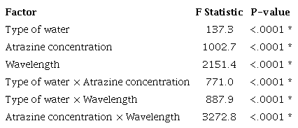 Table 1 shows the analysis of variance for the adjusted linear mixed model, where it is evidence that absorbance changes significantly depending on wavelength, atrazine concentration and type of water.