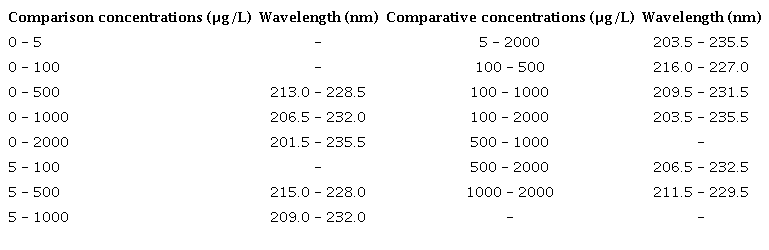 Different pollutants have different chemical structure, and the absorbance occurs at different wavelengths 19; the organic compounds absorb UV light (wavelength λ: 190 - 380 nm) proportionally to their concentration, which is a useful parameter for the qualitative estimation of organic substances, in addition to offering advantages such as versatility, low cost 18,3 and the simplicity of measurement 20.