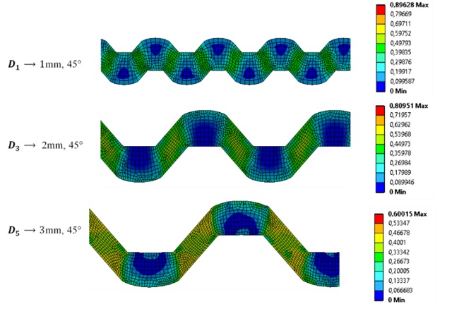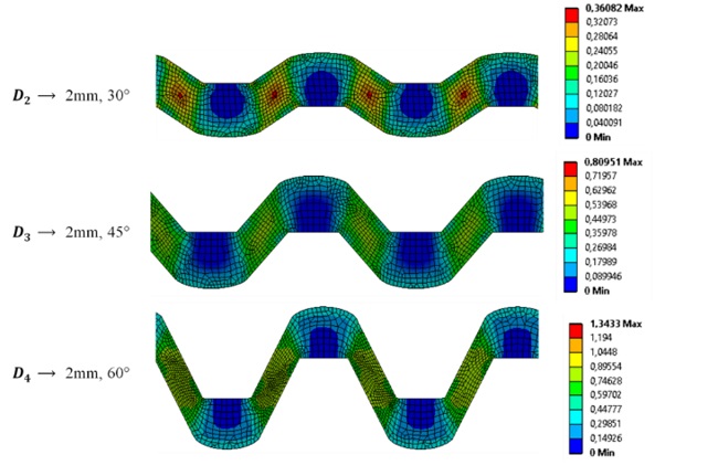𝐷2 model exhibited a higher strain concentration in the center of the inclined region, with a maximum strain value of approximately 0.33, which gradually decreases until a value of 0.14 in the upper and lower ends of the sheet. 𝐷4 model exhibited greater strain uniformity along the inclined region than 𝐷2 model, with a maximum value of approximately 0.82, but this time farther from the center and located closer to the interface (junction between flat and inclined regions), decreasing to a value of 0.63 in areas much closer to the interface. 𝐷3 model presented a similar behavior to 𝐷4 model, i.e., greater strain uniformity with respect to 𝐷2 model.