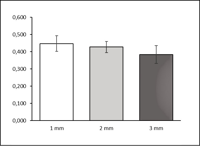 Figure 4 shows the effective strain simulation for groove width variations. In general terms, 𝐷1, 𝐷3 and 𝐷2 models presented similar maximum strain values; with maximum strain values of approximately 0.49, 0.47, and 0.45, respectively. When groove width increases, fewer strain levels are obtained. Figure 5 shows the effective strain mean and standard deviation for groove width variations. The mean effective strain values obtained showed an inverse relation between groove width and effective strain. Wang et al. 11 found a similar relation for different groove widths from 1 to 4 mm. However, their effective strain results varied substantially from one another, from 0.815 to 0.64. This differs from what was found in this work, in which little variation occurred. Eq. 6 may provide an explanation. In it, effective strain is modeled as a function of groove angle and it does not take into account the effect of groove width variations.
