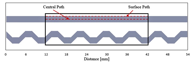 Figure 8 shows the strain distribution for surface node path, this path experiences a more complicated strain distribution curve compared to the central path, although it still preserves its periodical nature, this time repeating itself along the sheet every 8 mm. Also, the zoom in Figure 8 shows how the strain distribution curve changes along the different regions of the sheet. The upper flat region does not present much strain since it is not meant to be deformed at all, however, the same cannot be said for its lower flat counterpart. Even though theoretically this region should not experience any deformation either; simulation results show a near constant non-zero value at its surface because of die groove being pressed on it. The inclined regions present a mirror pattern of each other due to their symmetry. The curves present two distinctive crests, a little one at the interface between flat and inclined region, and a more pronounced one at the center of the inclined region.