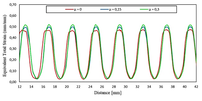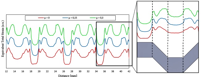 This behavior is because, at inclined regions, the effective strain is maximum, reaching values of around 0.5, while at flat regions it drops near to zero. It can be seen that at higher coefficient of friction, higher strain values are obtained, showing a slight but noticeable effect, as Wang et al. 12 also reported in a similar study. As expressed before, the effective strain does not drop completely to zero in flat regions. However, theoretically, the induced strain at inclined regions does not affect their flat counterparts. This idealized behavior does not occur, and a certain amount of strain induced, which can be seen as the small value presented in Figure 8. Yoon et al. 10 and Peng et al. 15 also found that the interface between flat and inclined region plays an important role on strain distribution.