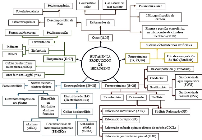 Dada la amplia gama de aplicaciones que continuamente surgen al utilizar el hidrógeno como un precursor alterno de energía, actualmente se conocen varias formas de producción, al igual que otros métodos no tan comunes (Figura 1), los cuales se caracterizan por involucrar varias rutas de producción tradicionales 12. Tradicionalmente, el hidrógeno puede producirse por rutas electroquímicas, bioquímicas, termoquímicas y fotoquímicas, partiendo de biomasa y combustibles fósiles (combustibles carbonosos) 13-15.