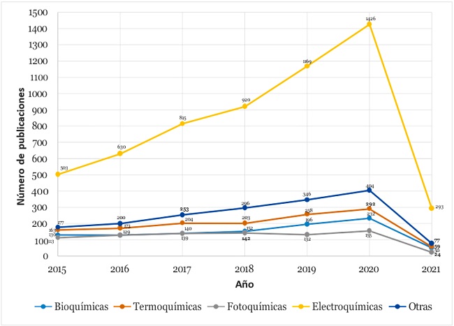 Durante los últimos 7 años, se ha evidenciado que los métodos electroquímicos para la producción de hidrógeno han sido los más estudiados con respecto a los demás métodos, y por lo tanto, es la ruta de la que mayor número de publicaciones por año se han realizado, alcanzando un máximo de 1426 publicaciones para el año 2020 (Figura 2).