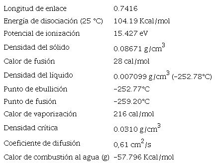 El hidrógeno es característico por exhibirse en condiciones estándar, como una sustancia gaseosa incolora, inodora, insípida e inflamable, que se enciende fácilmente produciendo una llama color azul pálido, y cuyos vapores son más ligeros que el aire 4. Sin embargo, a temperaturas muy bajas, y/o presiones muy elevadas, el gas se vuelve líquido o sólido 5. Los puntos de fusión y de ebullición tan bajos, son evidencia de las débiles fuerzas de atracción que existen entre las moléculas de hidrógeno. Este fenómeno, también se verifica por el hecho de que cuando el gas hidrógeno se expande de alta a baja presión a temperatura ambiente, su temperatura se incrementa, mientras que la temperatura de los demás gases disminuye. De acuerdo con los principios de la termodinámica, esto implica que las fuerzas repulsivas rebasan las fuerzas atractivas entre moléculas de hidrógeno a temperatura ambiente; de lo contrario, la expansión enfriaría el hidrógeno 6.
