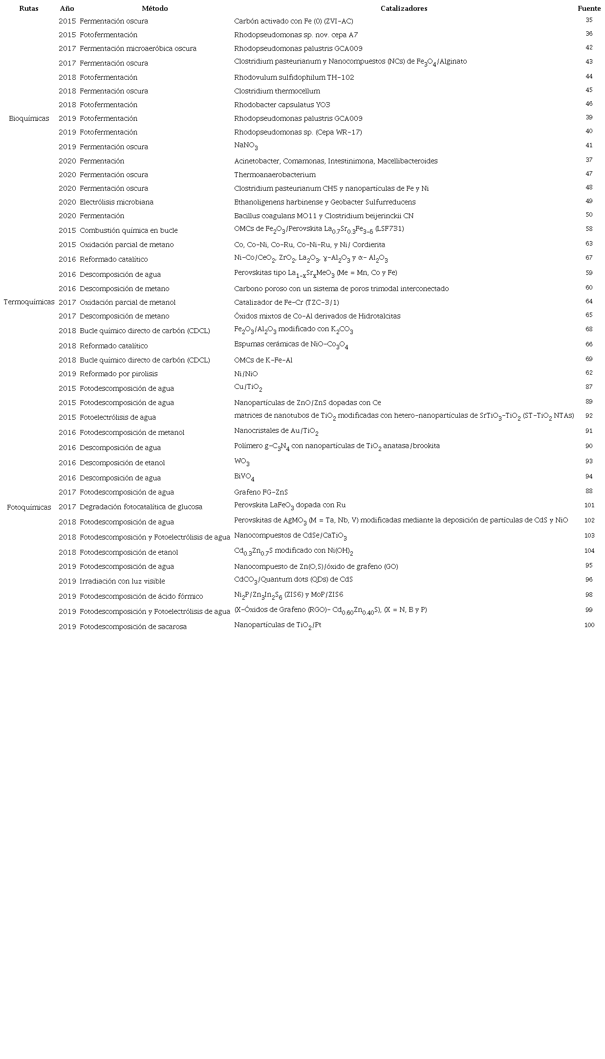 Dada la necesidad que ha surgido, por encontrar diferentes métodos de producción de hidrógeno, para dar abasto con la demanda energética mundial, se han desarrollado diversas investigaciones (Tabla 2), por las rutas convencionales (bioquímicas, termoquímicas, electroquímicas y fotoquímicas), como por las rutas no convencionales (procesos no catalíticos y procesos híbridos), partiendo de fuentes fósiles y de biomasa 11,19.
