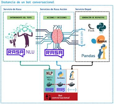 El servicio Rasa, este contiene los modelos de PLN y permite previo entrenamiento, entender el texto enviado por el usuario, clasificar automáticamente las intenciones de comunicación y acciones; finalmente enviar las acciones que deben realizarse para generar la respuesta.