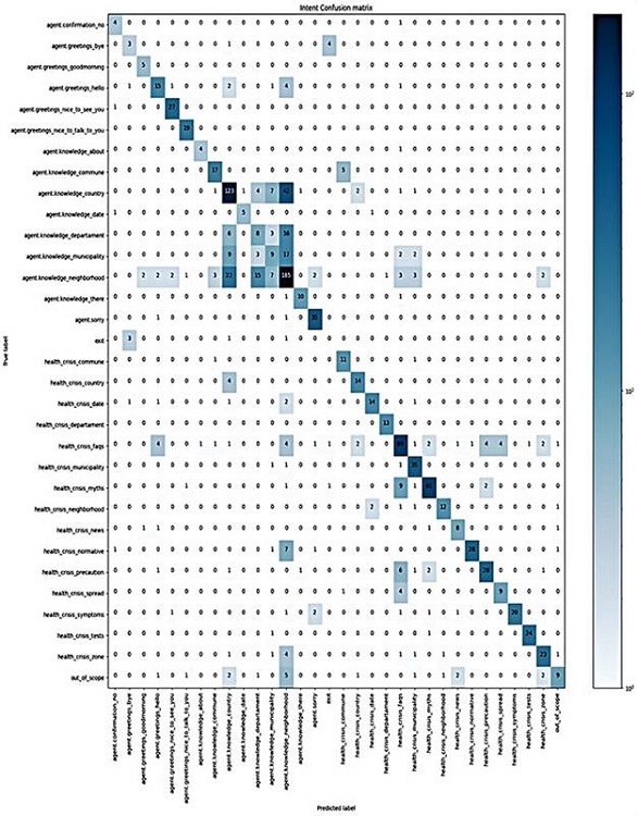 En la Figura 2, se presenta una matriz de correlación de las intenciones de comunicación, las filas representan las intenciones y en las columnas representan la clasificación realizada por el modelo automáticamente. La matriz de confusión del modelo BFAQ contiene colores oscuros, o con un mayor valor en la diagonal principal y con conteo bajo en otras zonas de la matriz. Esto significa que el modelo predice bien cuando las preguntas del usuario están relacionadas con covid-19, la mitigación, la precaución, la propagación, las medidas de prevención, entre otras preguntas comunes. Para preguntas relacionadas con el número de casos el modelo presenta tiende a fallar más, ya que la sintaxis de este tipo de preguntas es similar, preguntar por el número de casos en barrios, departamento o municipios poseen la misma estructura sintáctica y así el modelo presenta más errores en la matriz. La herramienta posee una combinación de tecnologías de NLU y PLN, para lograr la integración de datos de diferentes fuentes, datos públicos y el conocimiento disponible en las páginas web, noticias y documentos gubernamentales. Además, incorpora en su diseño un marco conversacional autónomo que responde de forma acertada a preguntas bajo situaciones de riesgo.