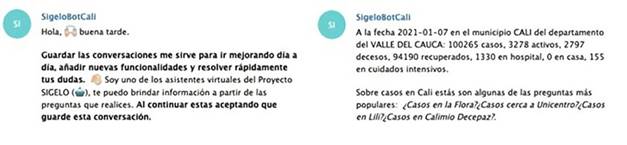 Como prototipo funcional se evalúa la herramienta chatbot prototipo con una encuesta de 10 preguntas politómicas. Esta evaluación se realizó con 32 participantes, profesionales con diferentes necesidades de información sobre la COVID-19 en Cali, con el fin de conocer su nivel de satisfacción. En la Figura 3, se presenta el saludo inicial de la herramienta, la respuesta que ofrece al preguntar por el número de casos en la ciudad y una muestra de las preguntas que más le han realizado y que pueden ser de interés, esta muestra es de la versión que utiliza el sistema de mensajería Telegram