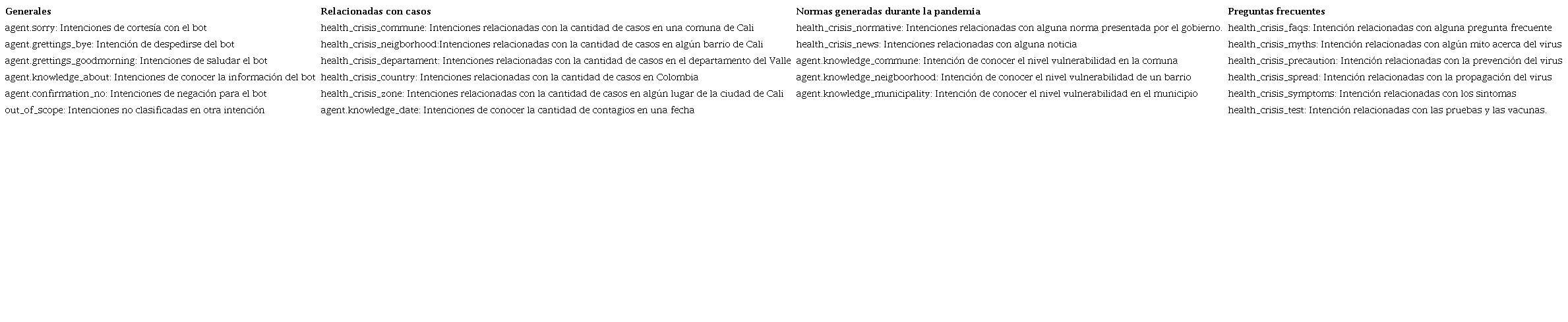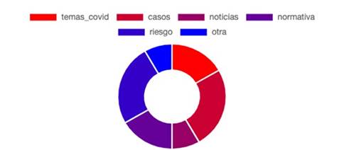 Dominio de la información: Una herramienta chatbot debe recibir el lenguaje natural directamente desde el texto de entrada del usuario y entender la demanda de información. En este trabajo, el modelo es de propósito específico o de dominio es cerrado, en especial para responder al escenario de riesgo de pandemia COVID-19. En este sentido, los textos, preguntas y conversaciones tendrán varias intenciones relacionadas con cuatro grupos: las relacionadas con casos, las que involucran normas generadas durante la pandemia, preguntas frecuentes y generales.