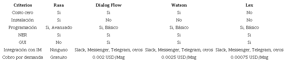 La Tabla 1 muestra que para los criterios costo cero, instalación, programación, GUI las herramientas son muy similares, a excepción de Rasa que permite una programación avanzada y si permite la instalación. Otro criterio que permite tomar una decisión de la tecnología a utilizar para la implementación es el cobro por demanda, pues esto implica que para el desarrollo de nuevos proyectos está limitado por el pago de acuerdo con el número de mensajes.