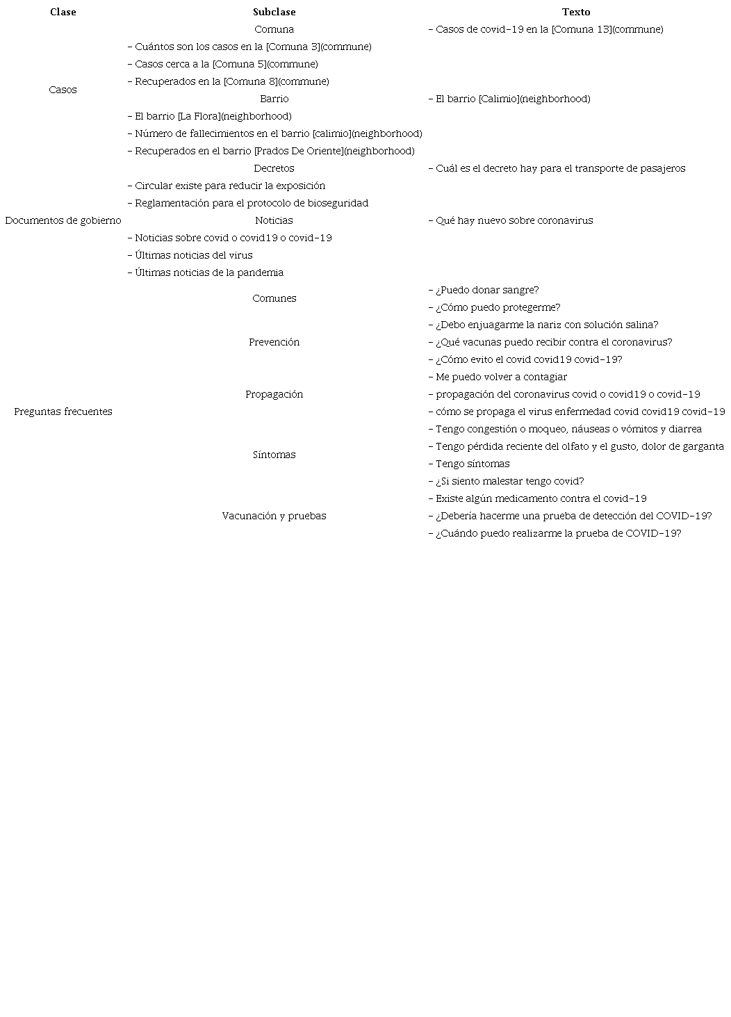 El conjunto de entrenamiento contiene textos con las entidades nombradas (EN), que permiten guiar al Chatbot por un grupo de intenciones relacionadas con la consulta de casos en sitios de interés de la ciudad, como barrios, comunas e incluso fechas. De igual manera los textos para entrenamiento incluyeron palabras claves que son elementos fijos en la solicitud del usuario y guían al Chatbot por las intenciones relacionadas con preguntas frecuentes, mitos, síntomas, decretos, normas y otras diferentes a los casos, ejemplo de ellas son: lavado de manos, dolor en el pecho, diabetes, síntomas, decretos, entre otras. En la Tabla 3, se presentan ejemplos del conjunto de entrenamiento, entre las que se destacan las entidades que hacen referencia a las comunas y barrios; y las palabras claves, noticias sobre el escenario de pandemia, entre otras.