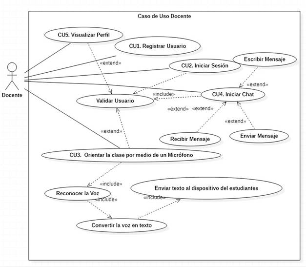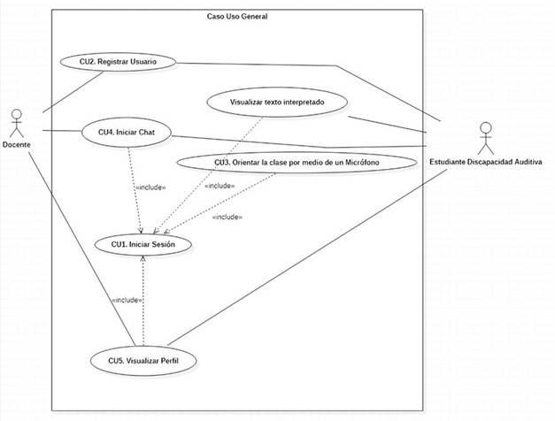 Es la interacción del docente y el estudiante con discapacidad auditiva, donde se da inicio con el código CU1; seguidamente, el estudiante procede a registrarse con el código CU2 para avanzar con la clase por medio de un micrófono (código CU3). Finalmente, la enseñanza se visualiza en un texto interpretado en el código CU4, permitiendo la interacción y comunicación con estudiante a través del chat (ver Figura 1).