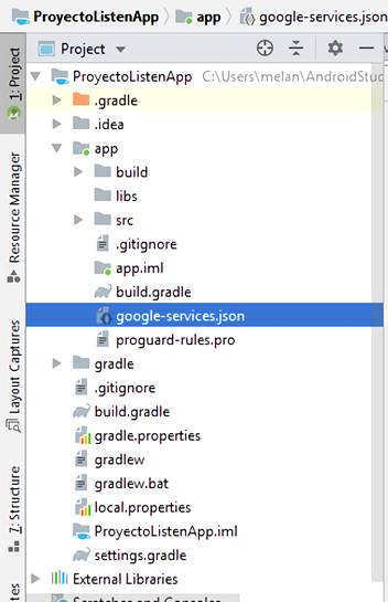 Seguidamente, se descarga un archivo de configuración generado por Firebase que se añade al proyecto en android. Este archivo es de tipo JSON, el cual contiene la información necesaria del proyecto para poder realizar la conexión con la aplicación registrada anteriormente por medio de la consola (Figura 10).