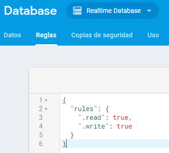 Adicionalmente, se pueden observar las reglas de seguridad de la aplicación en Firebase, la cual utiliza una notación JSON para definirlas, en este caso, otorgando permisos de lectura y escritura para cualquiera que esté en nuestra base de datos Firebase. La regla para el permiso de lectura comienza con “.read”, y la de escritura con “.write”. El valor true indica un permiso bajo (Figura 11).