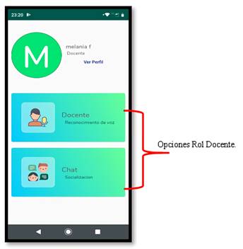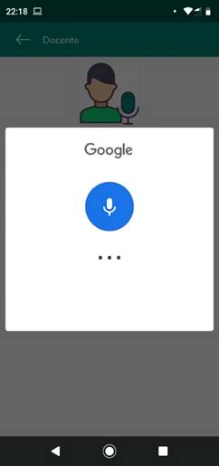 Al seleccionar la opción “Docente” aparecerá la interfaz de reconocimiento de voz (Figura 15). Además, para convertir la voz del docente en texto se ha usado la API de Google SpeechToText, la cual requiere que el dispositivo móvil donde se vaya a ejecutar tenga instalada la aplicación de síntesis de voz de google.