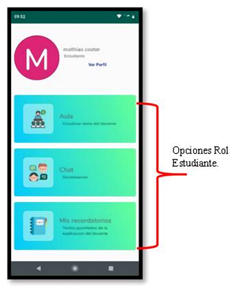 De igual forma, la Interfaz principal del estudiante se indica en la Figura 16. El primer proceso es “Aula” en la cual aparecerá una interfaz con el listado de los docentes que están registrados en la aplicación. En el método View Notas, referencia a “Micrófono” y utiliza un query por medio del cual manda a ordenar todas las notas del reconocimiento de voz realizado, ordenándolas por medio de la fecha (orderByChild ("Fecha")) y agregándolas a un ArrayList, para ser visualizadas por el estudiante. Por consiguiente, el segundo proceso que puede realizar el estudiante es “Chat”, anteriormente explicado en el rol docente. Por último, el estudiante podrá guardar las notas que desee en “Mis recordatorios”, una función que sirve para que el estudiante no tenga que realizar una exhaustiva búsqueda en “Aula”.