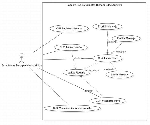 Caso de uso - CU3. Visualizar texto interpretado. El sistema permite al usuario de rol estudiante visualizar el texto interpretado a partir del reconocimiento de voz realizado del docente; es decir la traducción de la voz del docente en texto. Requerimiento: RF03, recondición: El usuario que puede visualizar el texto interpretado tiene que ser de rol estudiante. Flujo Normal: El usuario visualiza el texto que va apareciendo del respectivo reconocimiento de voz realizado, para una mejor comprensión de las clases dictadas por los docentes cuando el intérprete de lengua de señas no se encuentre en el aula de clase; Actor: El usuario de rol estudiante visualiza la pantalla con el texto que se produce de la traducción de la voz del docente y El sistema muestra el texto a medida que el docente va hablando; flujo alterno: Si el docente no selecciona el micrófono no va haber reconocimiento de voz por lo cual el estudiante tampoco podrá visualizar ningún texto. Postcondición: Mejor comprensión de las clases cuando el intérprete de lengua de señas no se encuentra en el aula de clase.