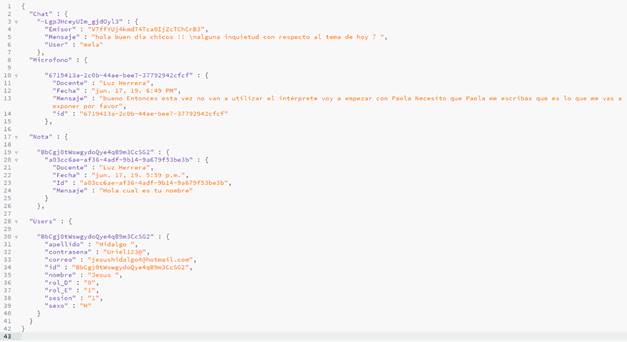 Para la implementación de la base de datos se trabajó con Firebase Database, una base de datos en tiempo real alojada en la nube por lo cual se puede contar con alta disponibilidad; además de esto brinda una interfaz de fácil comprensión y relativamente sencilla la cual se adapta de manera eficaz a la aplicación. Además, la base de datos no relacional utiliza una estructura diferente a las bases de datos relacionales. Esta estructura está basada en formato de tipo JSON. Por lo tanto, como todos los datos se almacenan en formato JSON la estructura de la base puede verse como un árbol JSON. También el siguiente árbol (Figura 3) muestra la estructura de los datos con los cuales trabaja la aplicación ListenApp, la cual incluye información de usuarios (“Users”), información del chat (“Chat”), textos de reconocimiento de voz que realiza el docente (“Micrófono”) y (“Notas”), que son los textos guardados por los estudiantes como recordatorios. El árbol cuenta con cuatro nodos principales que son “Users”,” Chat”, “micrófono” y “notas”. Estos nodos se utilizan para almacenar los datos correspondientes con los cuales funcionara la aplicación.