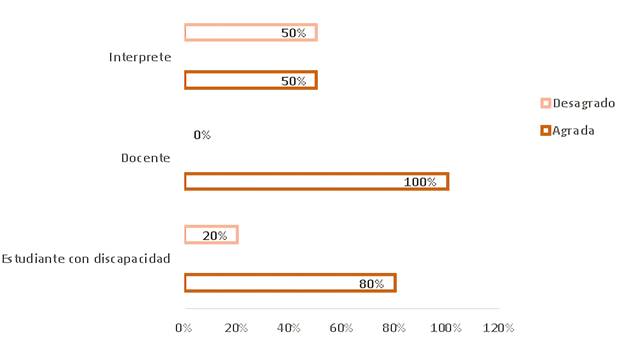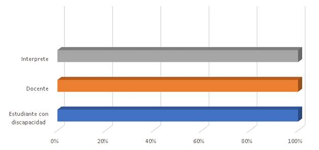 Se observa de igual manera, que al 80% de los estudiantes con discapacidad les parece satisfactoria la aplicación ListenApp, para utilizarla en forma sincrónica en la comunicación con el profesor de las asignaturas; también se presenta un 20% en estudiantes que no están de acuerdo con la aplicación ya que consideran que el intérprete será reemplazado por la aplicación ListenApp. Por último, un 50% en los intérpretes respondieron que la herramienta es satisfactoria, ya que sería un apoyo para ellos, cuando se les presente una dificultad en el acompañamiento y orientación del estudiante. Por otro lado, un 50% en los intérpretes no ve con agrado la utilización del móvil ya que consideran que serían remplazados por la aplicación.