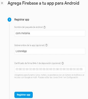 En la configuración de la base de datos dentro de la aplicación móvil es necesario incluir dentro de las dependencias de la aplicación Android las líneas del código, esto permite el uso de las funciones de Firebase dentro del proyecto por medio de las dependencias Adicionalmente, para permitir la conexión con Android y que la comunicación sea exitosa, se debe añadir la aplicación móvil a la base de datos a través de la consola de Firebase (Figura 9).