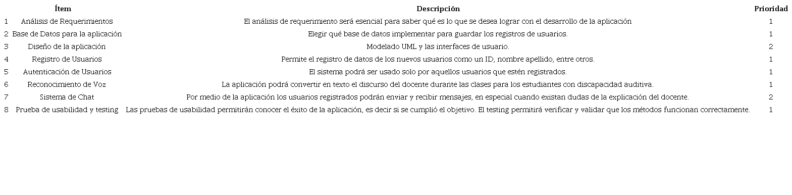 Se aplicó la metodología Scrum para el desarrollo de la aplicación móvil ListenApp, siguiendo las directrices para el desarrollo de aplicaciones. Por lo tanto, se creó el product backlog (lista priorizada de requisitos), dividendo cada ítem en las tareas que conformarían el sprint (Tabla 1).